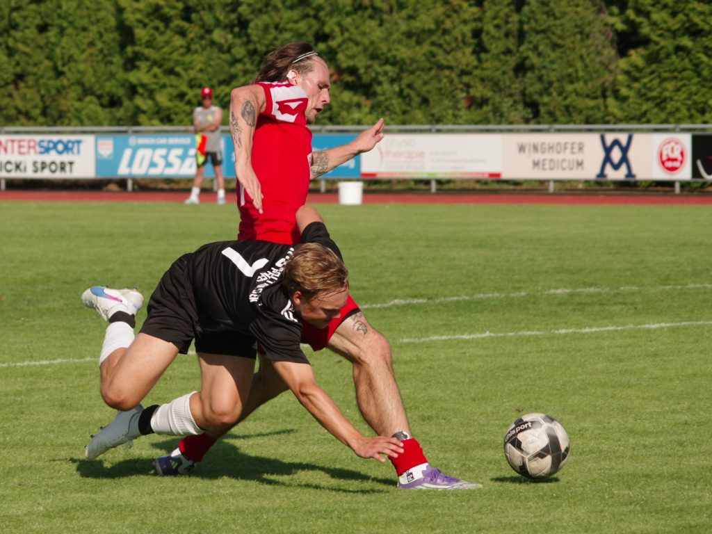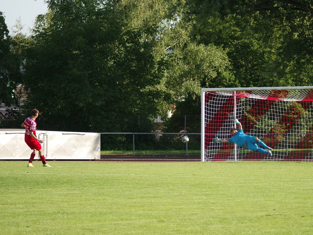 Der Bann ist gebrochen! Nachdem wir in der vergangenen Saison nach einem Elfmeter-Drama schon in der 1. Runde des Bezirkspokals ausgeschieden waren, kämpften wir uns diesmal trotz eines frühen Rückstands in die Partie zurück und hatten am Ende das Glück des Tüchtigen im Elfmeterschießen. Die Reserve des FC Rottenburg legte los wie die Feuerwehr: Mit aggressivem Forechecking und Galligkeit in den Zweikämpfen überrollten uns die Gastgeber zu Beginn und gaben bereits nach 40 Sekunden den ersten Warnschuss ab. Mit einem verunglückten Rückpass auf Höhe der Mittellinie luden wir Taylan Canpolat förmlich zur Führung ein, die sich dieser mit einem strammen Schuss ins rechte Eck nicht nehmen ließ (3.). Die Gastgeber verlegten sich fortan auf Konter und standen hinten stabil. Wir wirkten in dieser Phase verunsichert und leisteten uns jede Menge Fehlpässe im Aufbauspiel, was einen enormen Laufaufwand bedeutete. Mitte der 1. Hälfte näherten wir uns der Rottenburger Box mehr und mehr an, hatten durch einen in letzter Sekunde geblockten Schuss von Lukas Hartmann die erste echte Torchance (25.) und hätten durch Mike Kittels Nachschuss nach einem von ihm selbst getretenen Freistoß den Ausgleich erzielen können (37.). Diesen besorgte kurz darauf Alexander Norz, als er nach Vorarbeit von Fiore Guide und freundlicher Mithilfe der Rottenburger Abwehr zum Torabschluss kam (41.) – das 1:1 zur Pause war durchaus leistungsgerecht. Nach dem Seitenwechsel sorgten die Rottenburger mit einem Pfostentreffer für eine weitere Schrecksekunde bei unserem mitgereisten Anhang (46.). Auf der anderen Seite parierte der Rottenburger Keeper Philipp Abrosimov einen 20m-Schuß von Lukas Hartmann bravourös (52.). Wir waren jetzt deutlich zielstrebiger in unseren Offensiv-Aktionen: Nach Pass von Mike Mozer auf den eingewechselten Moritz Batte verpasste Jesse Lechner dessen Flanke nur ganz knapp (62.). Trotzdem mussten wir auf der Hut sein, denn die Gastgeber kamen vor allem über den pfeilschnellen Efosa Noel Igbinovia immer wieder gefährlich vor unseren Kasten. Wir hatten jedoch die größeren Torchancen zu verzeichnen: Nach Assist von Stefan Göhring war Moritz Batte links völlig frei, setzte das Leder aber knapp über den Rottenburger Querbalken (85.). Der eingewechselte Florian Remmler kam kurz vor Schluss nach Pass von Lukas Hartmann aus 5m zum Abschluss, aber wiederum vereitelte Philipp Abrosimov mit einer Klasse-Parade den Torerfolg (89.) – das hätte der Lucky Punch für uns sein können. So musste ein Elfmeterschießen entscheiden. Nachdem Alexander Beck, Stefan Göhring, Mike Mozer und Moritz Batte ihre Strafstöße sicher verwandelt hatten und die Gastgeber bereits 1x am Pfosten gescheitert waren, hielt unser Keeper Fabian Hartmaier den entscheidenden Elfer der Rottenburger. Aufgrund einer deutlichen Leistungssteigerung im zweiten Abschnitt ziehen wir insgesamt verdient in die 2. Runde ein, aber die Rottenburger haben uns bei hochsommerlichen Temperaturen alles abverlangt.