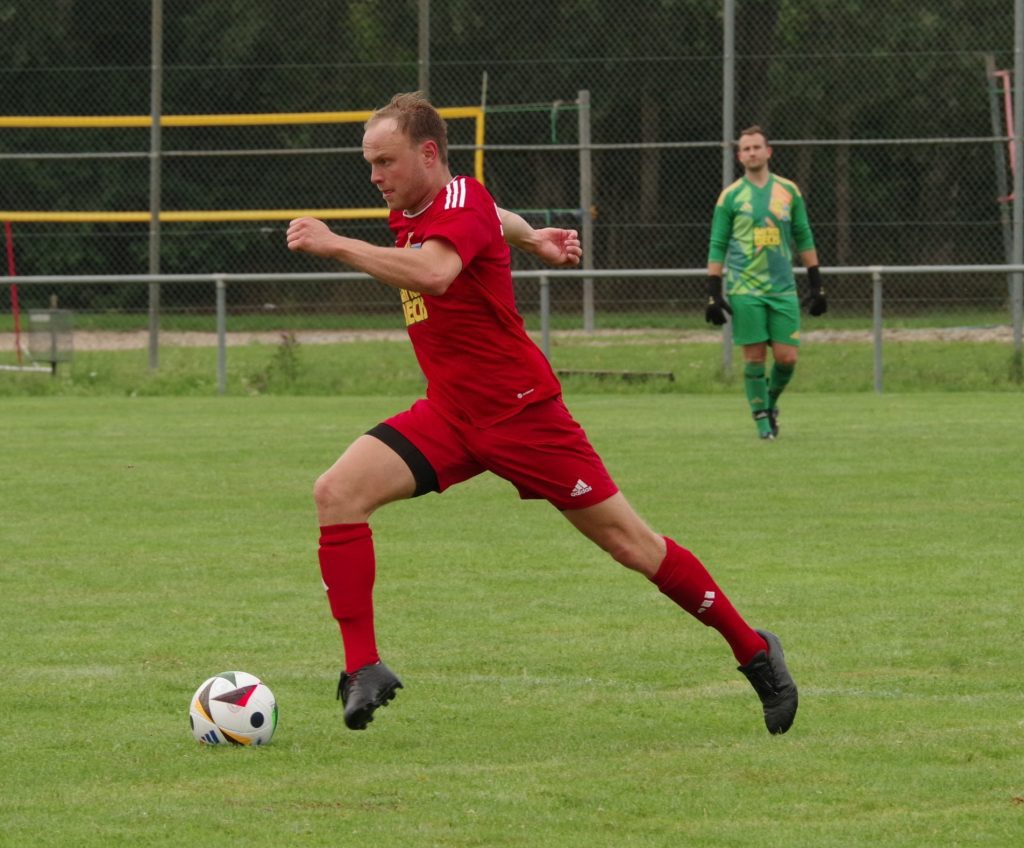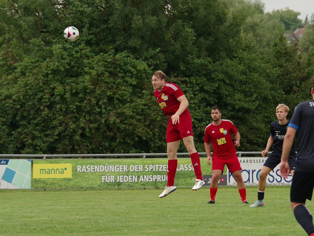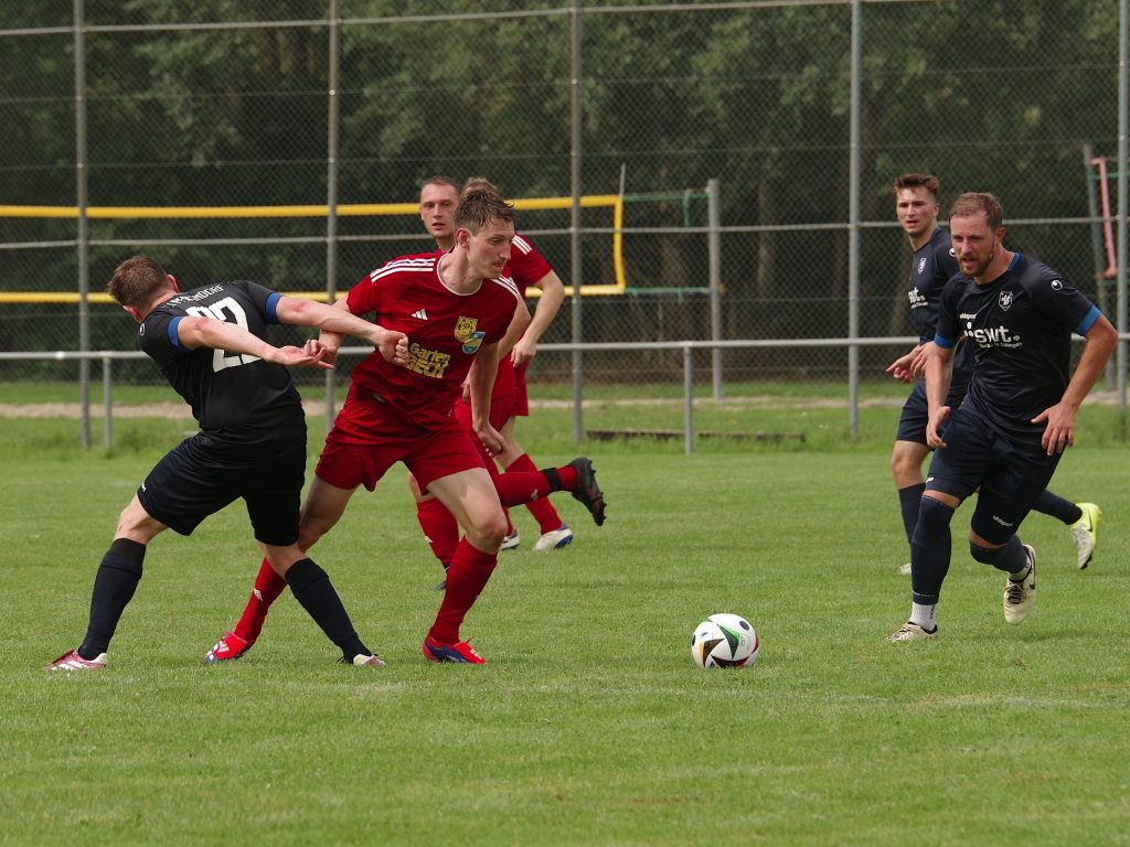 Bevor die neue Saison am kommenden Sonntag mit der 1. Runde des Bezirkspokals startet, testete unsere 1. Mannschaft am vergangenen Samstag gegen den SV Pfrondorf. Auf regennassem Rasen in Pfäffingen entwickelte sich im 1. Abschnitt ein offener Schlagabtausch. Jesse Lechner traf das Außennetz (7.), Tim Göhring scheiterte aus Nahdistanz am Pfrondorfer Keeper Jonathan Wutzler (15.). Davor hatten wir nach einem Vorstoß der Gäste bis zur Grundlinie Glück, dass die Hereingabe an den Außenpfosten abgelenkt wurde (10.). Als zudem eine 25m-Bogenlampe der Pfrondorfer unseren Querbalken küsste, hätten wir uns zu diesem Zeitpunkt nicht über einen Rückstand beschweren dürfen (25.). Danach verflachte die Partie etwas, weil sich beide Teams im Mittelfeld egalisierten und kaum zu Torabschlüssen kamen. Nach dem Seitenwechsel stand Fiore Guido nach einer Ecke von Jesse Lechner völlig frei im 5m-Raum, aber sein Schuss zischte über den Kasten (47.). Stattdessen ging der Bezirksligist per Kopfball nach einem an den langen Pfosten geschlenzten Freistoß in Führung (51.) Fiore Guido hätte den Ausgleich markieren können, als er sich aus 20m ein Herz fasste, aber leider nur den Pfrondorfer Querbalken traf (67.). Das Pech hielt auch noch weiter an: Keeper Pascal Baumgärtner rutschte das Leder nach einem Pfrondorfer Abschluss durch die Finger, so dass die Gäste nach diesem Geschenk etwas schmeichelhaft mit 0:2 in Front lagen (72.). Mike Kittel gab postwendend die richtige Antwort: Er erkämpfte sich die Kugel im Mittelfeld, zog unwiderstehlich in die Box und schloss wuchtig zum verdienten 1:2-Anschlußtreffer ab (73.). Der Ausgleich lag jetzt in der Luft: Der eingewechselte Florian Remmler tankte sich links wunderbar durch, flankte auf den im Zentrum postierten Felix Beeh, aber der Pfrondorfer Keeper Jonathan Wutzler war auf dem Posten (80.). Die Gäste drehten in den Schlussminuten nochmal auf, trafen unseren Außenpfosten (81.) und machten in der Schlussminute mit einem Schuss aus spitzem Winkel zum 1:3 endgültig den Deckel auf diese Partie (90.). Die Niederlage fiel am Ende etwas zu hoch aus, denn wir haben gegen den Bezirksligisten über weite Strecken auf Augenhöhe agiert.