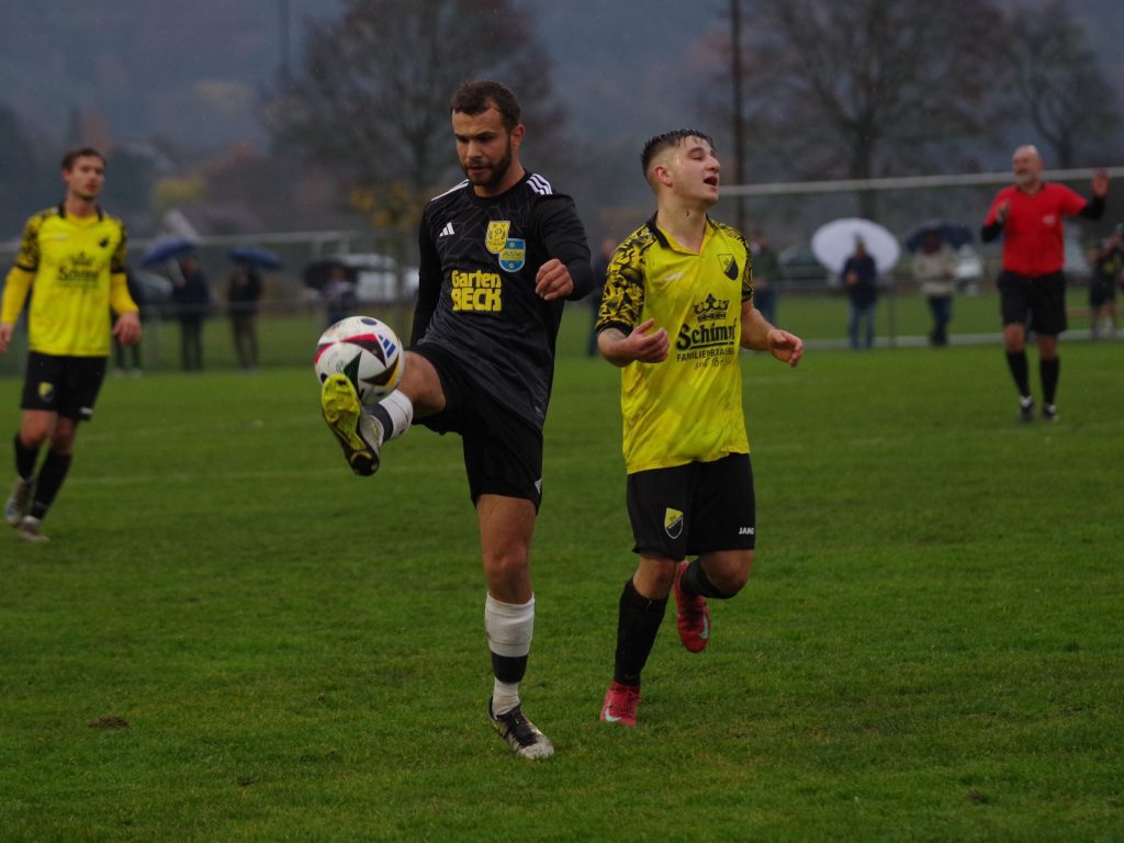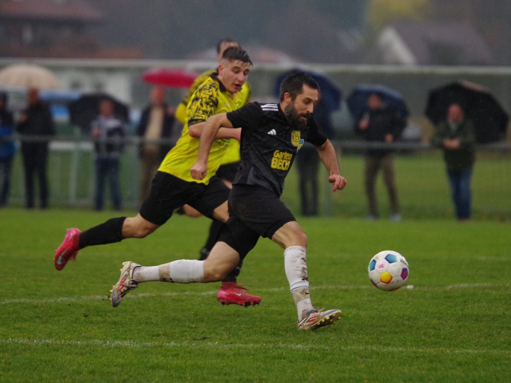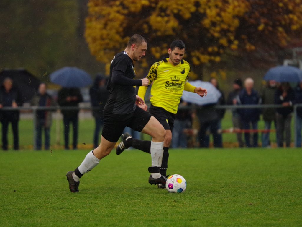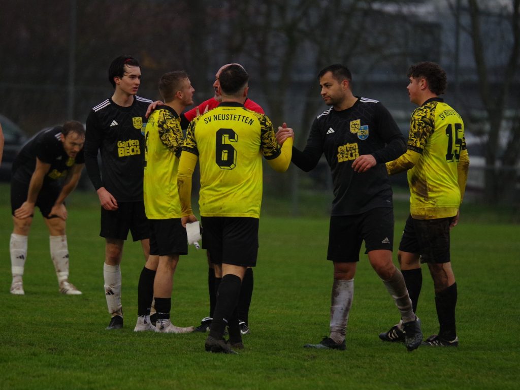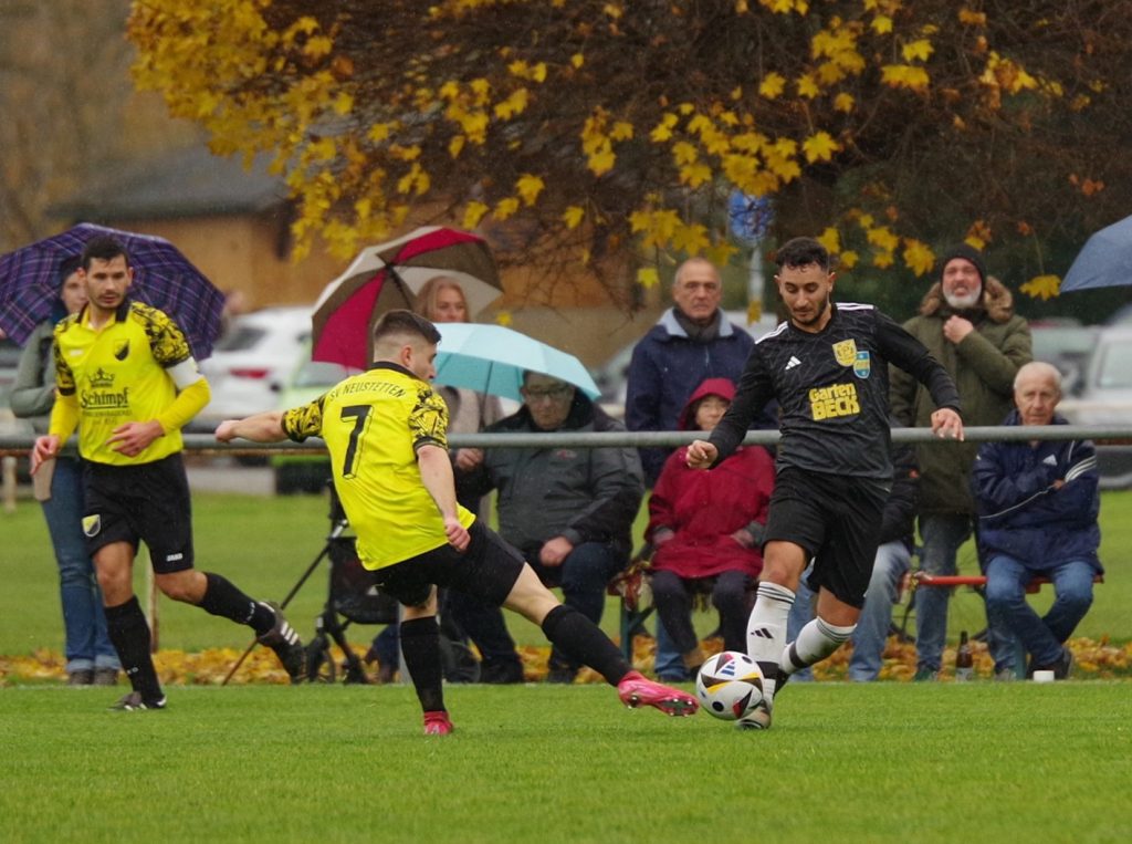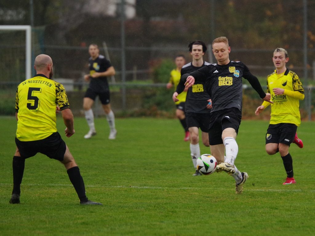 Mit dem Liga-Bestwert von nur 8 Gegentreffern aus 13 Partien reiste der Spitzenreiter SV Neustetten zu uns nach Pfäffingen, wo sich bei Dauerregen auf glitschigem Rasen eine kampfbetonte Partie entwickelte, in der beide Abwehr-Reihen dominierten. Keiner wollte den ersten Fehler machen, offensive Vorstöße endeten meist schon im Mittelfeld. Die weiten Diagonalbälle von Spieler-Trainer Rafael Rees waren eine sichere Beute unserer letzten Linie, auf der anderen Seite hatte Alex Norz nach Freistoß von Chris Boller die erste nennenswerte Torchance, aber sein Kopfball wurde von Keeper Nico Zeitter noch über den Querbalken gelenkt (17.). Von den Gästen war offensiv nichts zu sehen, nur eine einzige echte Tormöglichkeit stand vor dem Seitenwechsel auf dem Zettel. Nach einer schnellen Kombination über Moritz Wachendorfer und Jannik Klein kam Marc Zeitter auf der linken Seite zum Abschluss, aber unser Keeper Pascal Baumgärtner war zur Stelle (32.). Kurz vor seiner verletzungsbedingten Auswechslung kam Alex Norz nochmals aus zentraler Position zum Abschluss, verzog aber knapp links (41.). Auch nach dem Seitenwechsel lag unsere Führung in der Luft. Jesse Lechner fand den eingewechselten Felix Beeh auf der rechten Außenbahn, der perfekt für Fiore Guido auflegte, dessen Schuss aus 14m allerdings über dem Gebälk landete (48.) – was für eine Chance! Die Gäste ließen erstaunlich viel zu, berappelten sich aber Mitte der 2. Halbzeit und erarbeiteten sich mehr Spielanteile, jedoch kaum klare Einschussmöglichkeiten. Top-Scorer Bastian Schimpf war bei unserer leidenschaftlich kämpfenden Abwehr in sicheren Händen – bis wir ihn ein einziges Mal aus den Augen verloren. Nach einer Ecke von Moritz Wachendorfer traf er nach einem Gewusel im Strafraum im Nachschuss zum 0:1 (73.) – das nennt man Effizienz! Wir warfen jetzt alles nach vorne: Für Patrick Walter war der Winkel nach Freistoß von Marcel Schmid zu spitz (78.), bevor die Gäste nach einer Unsicherheit von Nico Zeitter Glück hatten, dass Marcel Schmid das Leder aus Nahdistanz nicht optimal traf (90.). Die Zeit rannte uns davon – sollten wir wirklich wie letzte Woche wieder leer ausgehen? Ein letzter Freistoß wurde von Marcel Schmid in die Box geschlagen, wo Mike Mozer an die Kugel kam und Malte Stauß den Ableger ins rechte Kreuzeck setzte (90.+4) – es folgte grenzenloser Jubel über den 1:1-Ausgleich in allerletzter Sekunde! Wir haben dem Spitzenreiter über weite Strecken Paroli geboten, haben uns mehr Torchancen als die Gäste erarbeitet und uns den Punkt am Ende auch aufgrund einer hervorragenden Abwehrleistung redlich verdient. Unser Respekt gilt Schiedsrichter Ahmet Koc, der die nicht einfache Partie mit viel Übersicht und Fingerspitzengefühl souverän leitete.