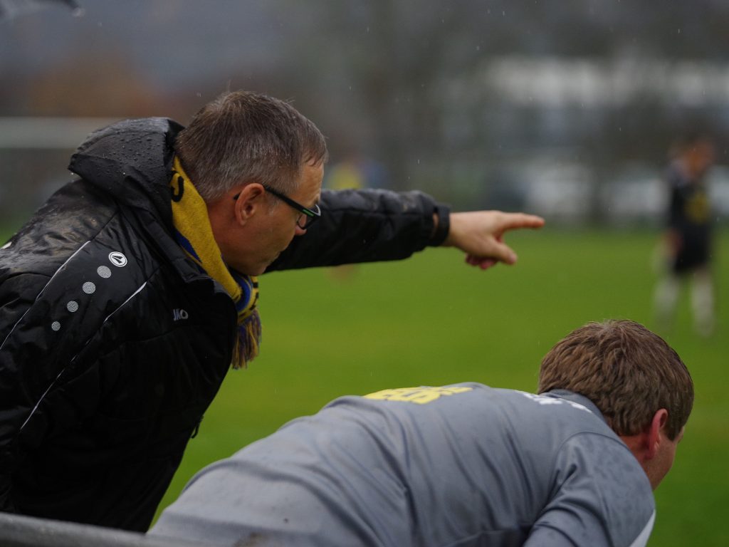Trainer Jörg Eyth mit letzten Anweisungen für Patrick Walter vor dessen Einwechselung (60.)