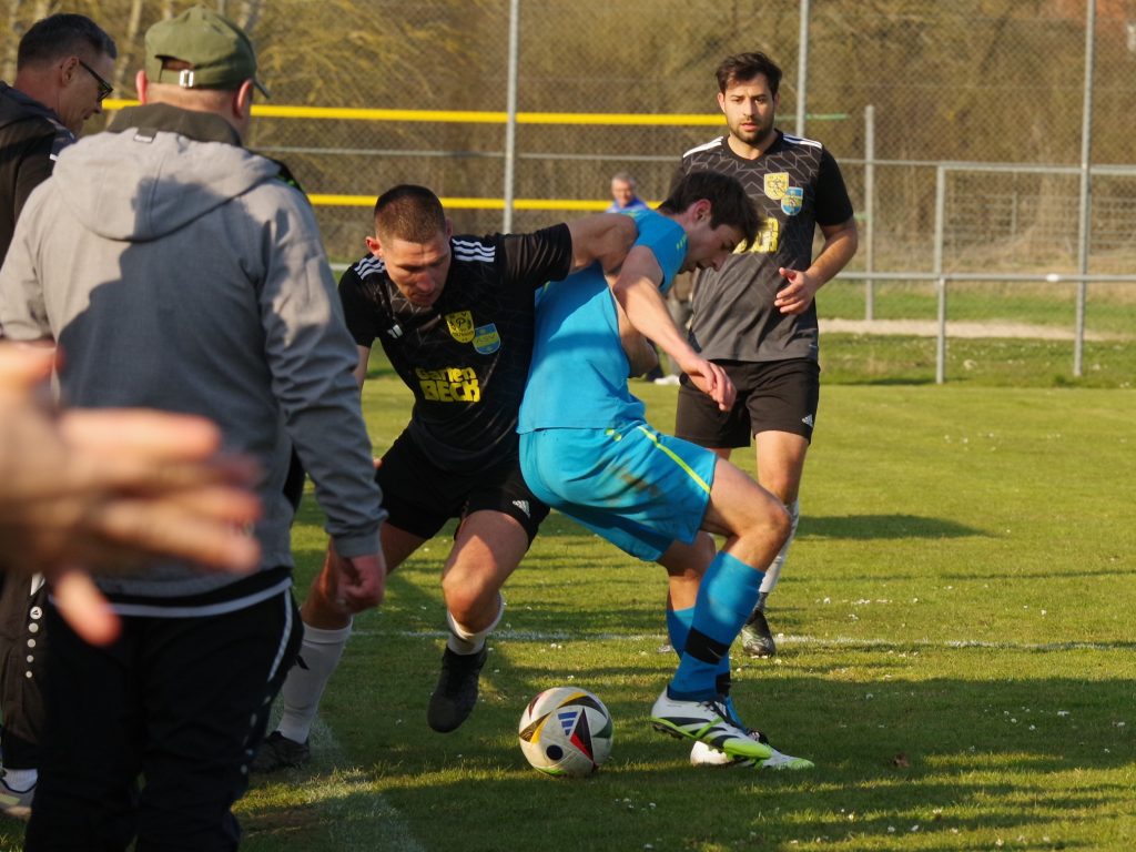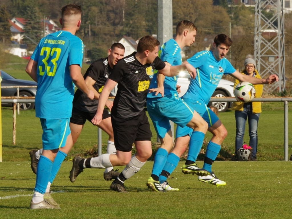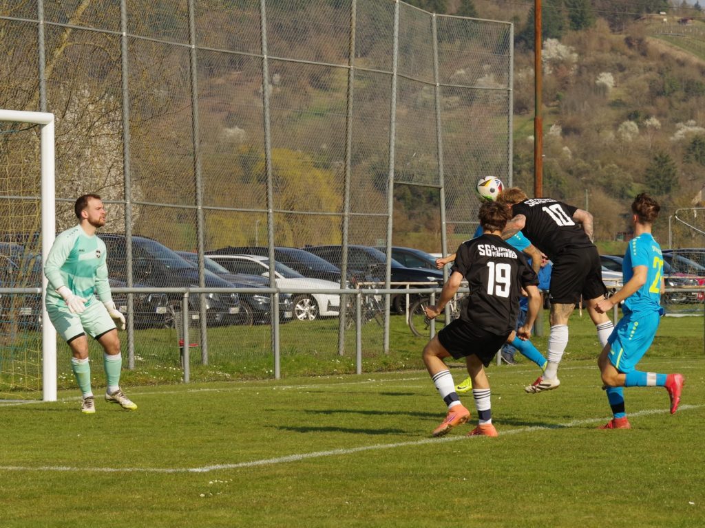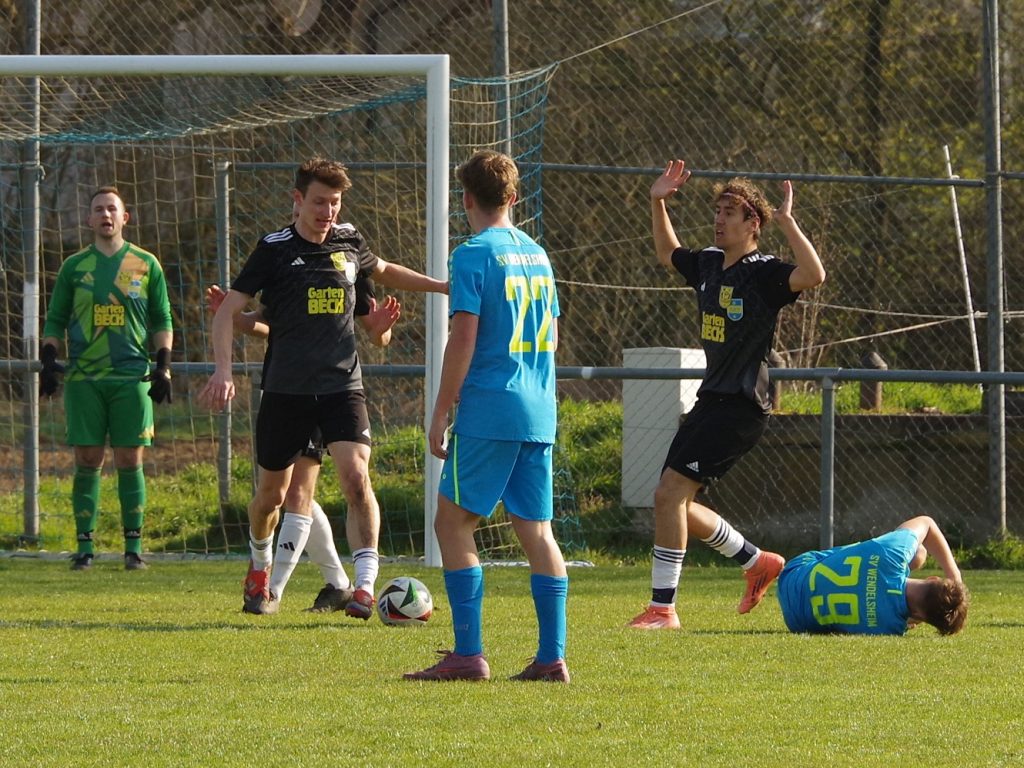 Die gegen den Abstieg kämpfenden Gäste brachten von der ersten Minute an alles auf den Platz, was in ihrer Situation gefragt ist: Galligkeit in den Zweikämpfen, hohe Laufbereitschaft und schnelle Konter aus einer massiven Abwehr. Unser Keeper Pascal Baumgärtner war bei einem gefährlichen Schuß von Finley Klett gleich in der Anfangsphase gefordert (3.), während wir eine Viertelstunde bis zu unserem ersten Torschuß durch Marcel Schmid brauchten (15.). Die Wendelsheimer standen gut und ließen uns nicht zur Entfaltung kommen. Mit seinem sehenswerten 50m-Schuß zum 1:0 über den weit vor seinem Kasten stehenden SVW-Keeper Marvin Bort löste Marcel Schmid den Knoten in unserem Spiel (25.). Allerdings verloren wir in dieser Phase unseren linken Außenverteidiger Christian Boller, der sich schwer am linken Fuß verletzte (27.) – für ihn kam Niklas Kaupp in die Partie. Mit einem wunderbar herausgespielten Angriff über die rechte Seite hätten wir fast auf 2:0 gestellt: Mike Kittel passte auf Stefan Göhring, dessen Flanke Fabian Grammer im Zentrum nur haarscharf verpasste (35.). Die Gäste spielten ebenfalls mit und kamen durch Matthis Fecht nach Zuspiel von Manuel Brunnenmiller zu ihrer zweiten Großchance – das Leder küsste unseren Innenpfosten und sprang von dort zurück ins Feld (39.). Der Ausgleich hatte sich somit angekündigt und fiel dann auch prompt: Samuel Lindner dribbelte sich in unseren Strafraum und wurde von den Beinen geholt – Schiedsrichter Besim Dedinca entschied sofort auf Strafstoß, den Manuel Brunnenmiller kurz vor der Pause zum 1:1 verwandelte (42.). Wir kamen mit der richtigen Einstellung aus der Kabine: Lukas Hartmann schlug von rechts einen hohen Ball in die Box, unser Goalgetter Alex Norz gewann das Kopfball-Duell am langen Pfosten und traf zur erneuten Führung (47.). Wir drückten die Gäste jetzt immer mehr in die eigene Hälfte: Nach Zuspiel von Alex Norz zog Fabian Grammer aus 20m artistisch aus der Drehung ab, Keeper Marvin Bort war zwar noch mit der Hand am Ball, konnte den Einschlag zum 3:1 aber nicht mehr verhindern (55.). Wir hatten alles im Griff, bis Schiedsrichter Besim Dedinca unseren Innenverteidiger Marco Eyth mit Gelb-Rot vom Platz schickte (73.) – eine aus unserer Sicht zu harte Entscheidung. So wurde es in Unterzahl nochmal richtig eng: Wendelsheim wurde mit der zweiten Luft immer gefährlicher und bekam einen weiteren Strafstoß zugesprochen: Diesmal fischte Pascal Baumgärtner den von Manuel Brunnenmiller getretenen Elfmeter aus dem rechten unteren Eck (78.) – ein ganz wichtiger Save unseres Keepers! In der Schlußphase warfen die Wendelsheimer alles nach vorn, so dass sich für uns Räume ergaben. Der nach 7-wöchiger Verletzungspause zurückgekehrte Florian Remmler hatte Keeper Marvin Bort bereits umkurvt, traf bei seinem Abschluß jedoch Team-Kollege Niklas Kaupp vor der Linie, sonst wäre das 4:1 der perfekte Einstand gewesen (90.+1). Mit diesem Derby-Sieg des Willens rücken wir in der Tabelle auf Rang 3 vor und sind nun bereits seit 6 Liga-Spielen ungeschlagen.