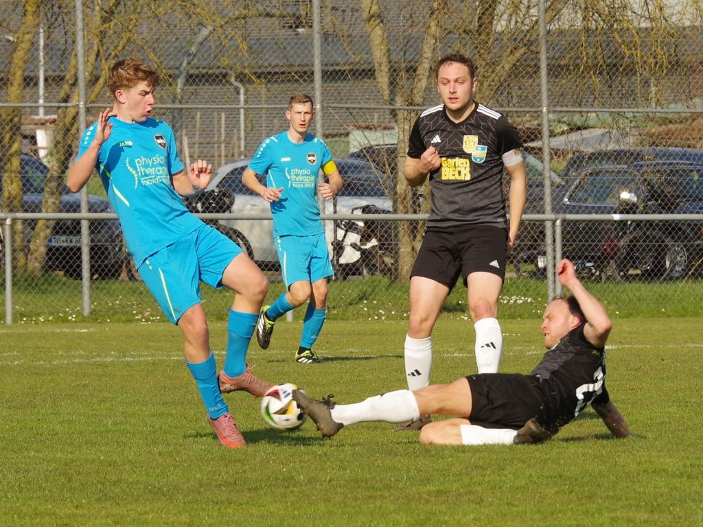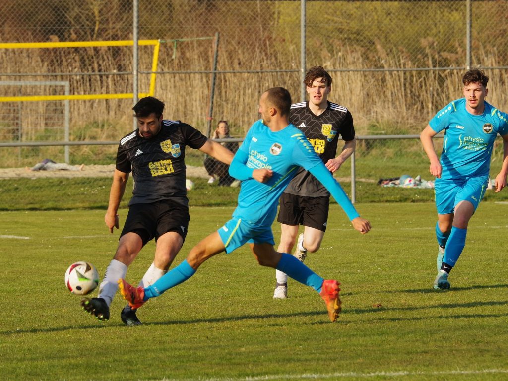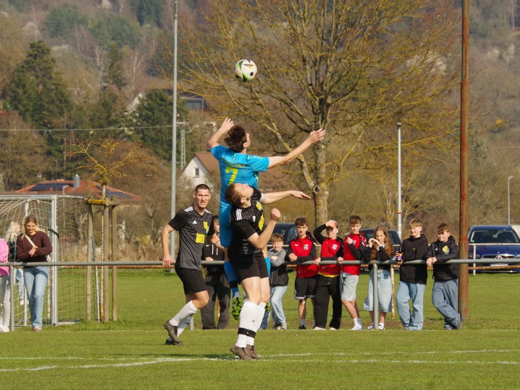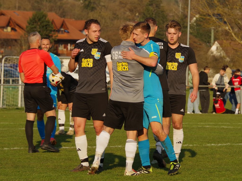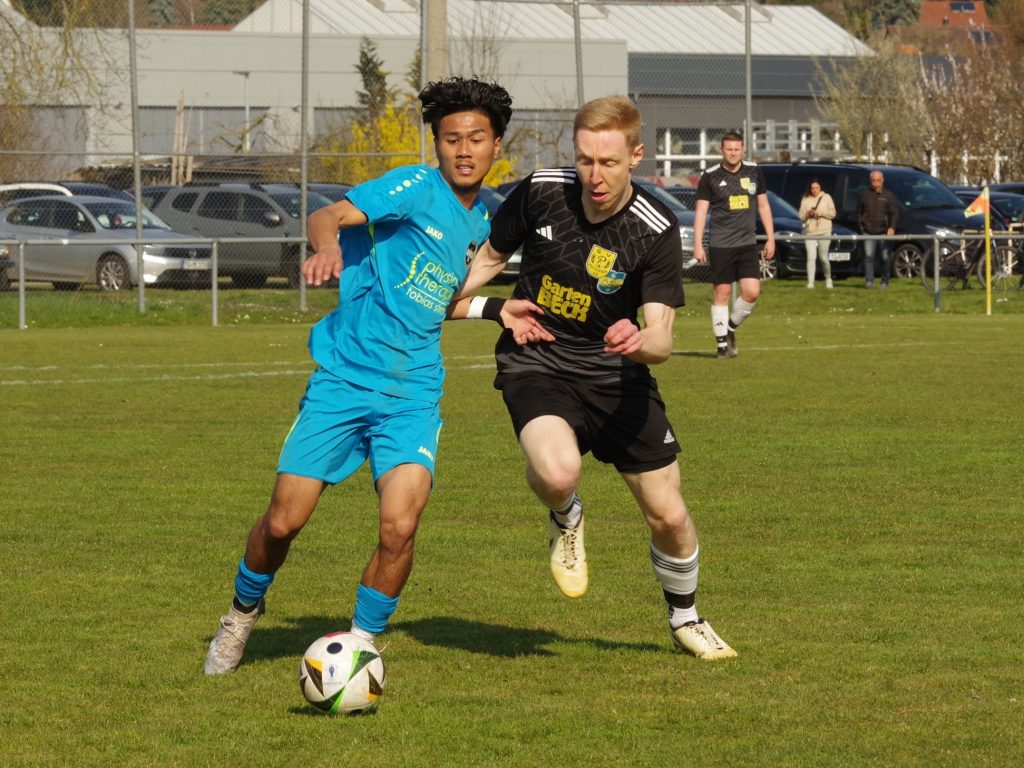 Die gegen den Abstieg kämpfenden Gäste brachten von der ersten Minute an alles auf den Platz, was in ihrer Situation gefragt ist: Galligkeit in den Zweikämpfen, hohe Laufbereitschaft und schnelle Konter aus einer massiven Abwehr. Unser Keeper Pascal Baumgärtner war bei einem gefährlichen Schuß von Finley Klett gleich in der Anfangsphase gefordert (3.), während wir eine Viertelstunde bis zu unserem ersten Torschuß durch Marcel Schmid brauchten (15.). Die Wendelsheimer standen gut und ließen uns nicht zur Entfaltung kommen. Mit seinem sehenswerten 50m-Schuß zum 1:0 über den weit vor seinem Kasten stehenden SVW-Keeper Marvin Bort löste Marcel Schmid den Knoten in unserem Spiel (25.). Allerdings verloren wir in dieser Phase unseren linken Außenverteidiger Christian Boller, der sich schwer am linken Fuß verletzte (27.) – für ihn kam Niklas Kaupp in die Partie. Mit einem wunderbar herausgespielten Angriff über die rechte Seite hätten wir fast auf 2:0 gestellt: Mike Kittel passte auf Stefan Göhring, dessen Flanke Fabian Grammer im Zentrum nur haarscharf verpasste (35.). Die Gäste spielten ebenfalls mit und kamen durch Matthis Fecht nach Zuspiel von Manuel Brunnenmiller zu ihrer zweiten Großchance – das Leder küsste unseren Innenpfosten und sprang von dort zurück ins Feld (39.). Der Ausgleich hatte sich somit angekündigt und fiel dann auch prompt: Samuel Lindner dribbelte sich in unseren Strafraum und wurde von den Beinen geholt – Schiedsrichter Besim Dedinca entschied sofort auf Strafstoß, den Manuel Brunnenmiller kurz vor der Pause zum 1:1 verwandelte (42.). Wir kamen mit der richtigen Einstellung aus der Kabine: Lukas Hartmann schlug von rechts einen hohen Ball in die Box, unser Goalgetter Alex Norz gewann das Kopfball-Duell am langen Pfosten und traf zur erneuten Führung (47.). Wir drückten die Gäste jetzt immer mehr in die eigene Hälfte: Nach Zuspiel von Alex Norz zog Fabian Grammer aus 20m artistisch aus der Drehung ab, Keeper Marvin Bort war zwar noch mit der Hand am Ball, konnte den Einschlag zum 3:1 aber nicht mehr verhindern (55.). Wir hatten alles im Griff, bis Schiedsrichter Besim Dedinca unseren Innenverteidiger Marco Eyth mit Gelb-Rot vom Platz schickte (73.) – eine aus unserer Sicht zu harte Entscheidung. So wurde es in Unterzahl nochmal richtig eng: Wendelsheim wurde mit der zweiten Luft immer gefährlicher und bekam einen weiteren Strafstoß zugesprochen: Diesmal fischte Pascal Baumgärtner den von Manuel Brunnenmiller getretenen Elfmeter aus dem rechten unteren Eck (78.) – ein ganz wichtiger Save unseres Keepers! In der Schlußphase warfen die Wendelsheimer alles nach vorn, so dass sich für uns Räume ergaben. Der nach 7-wöchiger Verletzungspause zurückgekehrte Florian Remmler hatte Keeper Marvin Bort bereits umkurvt, traf bei seinem Abschluß jedoch Team-Kollege Niklas Kaupp vor der Linie, sonst wäre das 4:1 der perfekte Einstand gewesen (90.+1). Mit diesem Derby-Sieg des Willens rücken wir in der Tabelle auf Rang 3 vor und sind nun bereits seit 6 Liga-Spielen ungeschlagen.