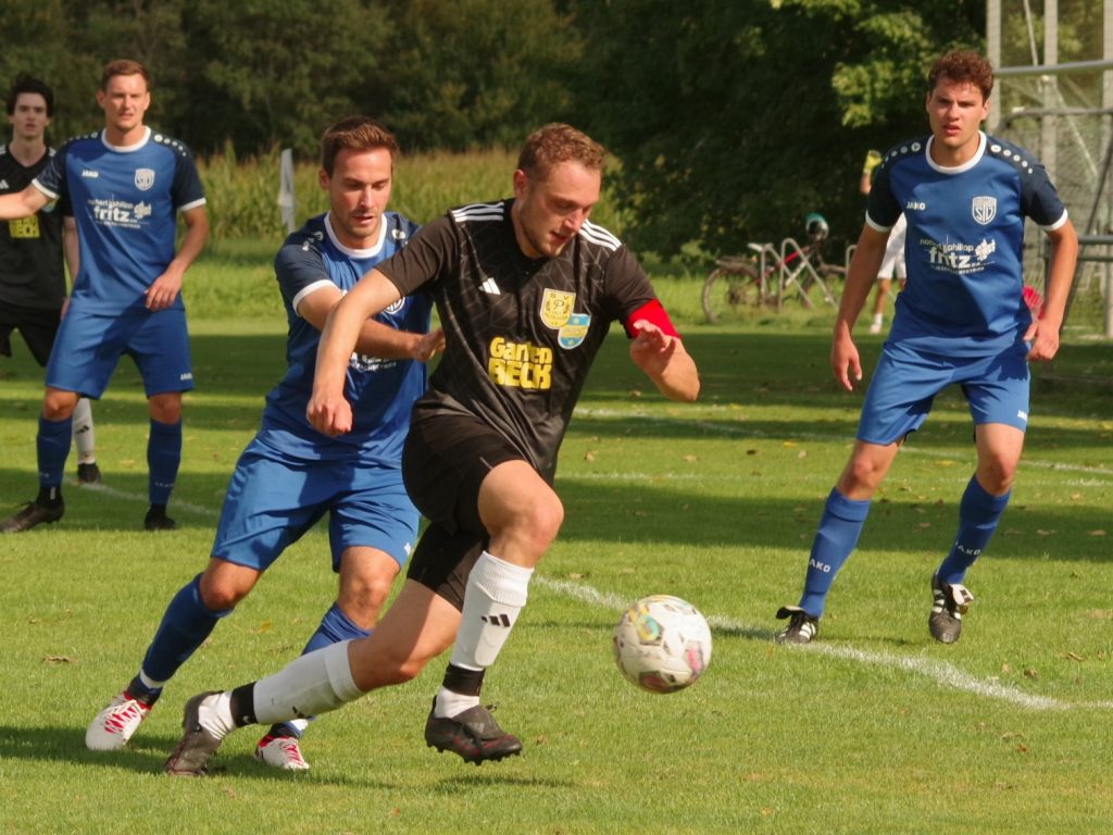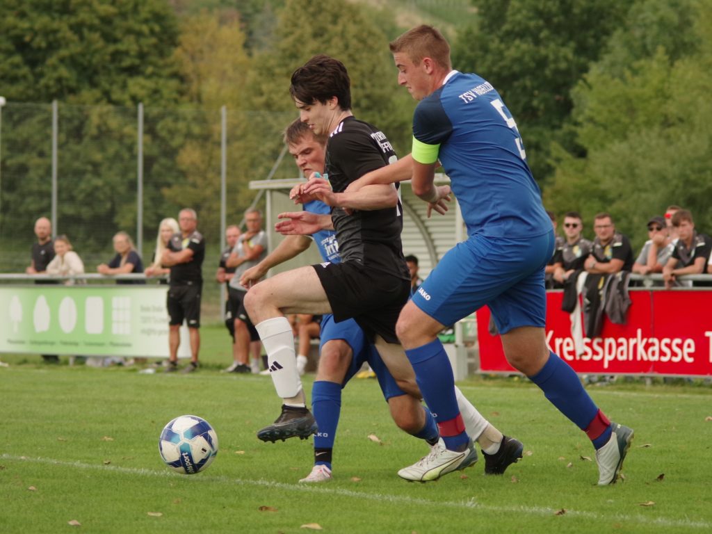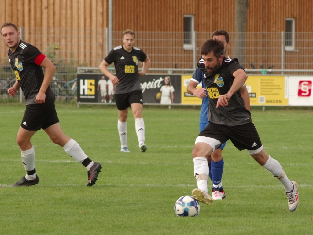 Nach einer halben Stunde hatte wohl niemand unter den etwa 300 Zuschauern geglaubt, dass dieses Spiel noch ein echter Derby-Fight werden würde. Wir konnten bis zu diesem Zeitpunkt im Mittelfeld schalten und walten, dominierten die Partie nach Belieben und lagen bereits mit 2:0 durch einen Doppelpack von Mike Kittel in Front. Nur 40 Sekunden nach dem Anpfiff versenkte er eine Flanke von Fiore Guido zum 1:0 (1.) und wenig später einen Pass von Lukas Hartmann zum 2:0 (10.). Eine umstrittene Entscheidung gab der Partie jedoch eine ungeahnte Wendung. Moritz Batte ergatterte einen zu kurz geratenen Rückpass der Gastgeber, lief auf seinen ehemaligen A-Jugend-Mitspieler Jakob Hölle als letzten Abwehrmann zu und kam zu Fall – Schiedsrichter Armin Sigler zeigte die Rote Karte (30.). In Unterzahl spielte Hagelloch/Unterjesingen plötzlich Fußball und brachte uns gehörig in Schwierigkeiten. Ein Schuss aus der Drehung von Janick Speth landete noch knapp rechts über dem Kasten (34.), aber wenig später traf Julian Wehner nach Vorarbeit von Matthias Loy ins lange Eck zum 2:1-Anschlußtreffer (39.). Auch nach dem Seitenwechsel witterten die Gastgeber ihre Chance. Mittelfeld-Motor Max Leibfahrt war jetzt kaum noch zu stoppen – spielten wir wirklich in Überzahl? Matthias Loy hatte per Kopf die Riesen-Chance zum Ausgleich, aber unser Keeper Pascal Baumgärtner parierte (53.). In einer zunehmend hitzigen Atmosphäre brauchten wir unbedingt das dritte Tor: Der aktuell in bestechender Form agierende Jesse Lechner beruhigte die Nerven aller Gäste-Fans und nagelte die Kugel aus kurzer Distanz zum 3:1 unter die Querlatte (56.) – und sorgte damit wieder für mehr Spielkontrolle. Unser eingewechselter Routinier Patrick Walter prüfte Keeper Timo Drescher mit einem 20m-Knaller (73.), bevor wir uns durch die Gelb-Rote Karte für Stefan Göhring wieder in gefährliches Fahrwasser begaben (77.). Der darauffolgende Freistoß wurde von Keeper Timo Drescher aus der eigenen Hälfte nach vorne geschlagen, wo Julian Wehners Schuss vom Innenpfosten ins Tor sprang (79.). Sein Doppelpack zum 3:2-Anschlußtreffer sorgte nun endgültig für hektisches Treiben auf beiden Seiten. Glück für uns, dass der eingewechselte Lion Rittsteiger aus 5m das leere Tor nicht traf (83.), bevor Malte Stauß als letzter Mann gerade noch retten konnte (88.). Die wilde Schlussphase war nichts für schwache Nerven. Wir kassierten in der Nachspielzeit noch weitere 4 Gelbe Karten von Schiedsrichter Armin Sigler, dem aus unserer Sicht das Fingerspitzengefühl für diese Partie fehlte. Mit vereinten Kräften verteidigten wir hinten alles weg und sicherten am Ende den 3:2-Sieg gegen eine aufopferungsvoll kämpfende SGM Hagelloch/Unterjesingen, die sich trotz des frühen Rückstands und der zwischenzeitlichen Unterzahl nie aufgab und uns alles abverlangte, was in einem Derby gefordert ist.